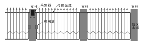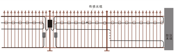 1. Laying method of optical cable: When laying optical cable on wrought iron, as wrought iron is hard, the number of sensing optical cables should be increased to ensure that intrusion signals can be reliably sensed. By analyzing the action characteristics of intruders crossing the fence, it is suggested to lay a sensing optical cable along the top, middle and bottom horizontal iron railings of wrought iron, as shown in the figure.