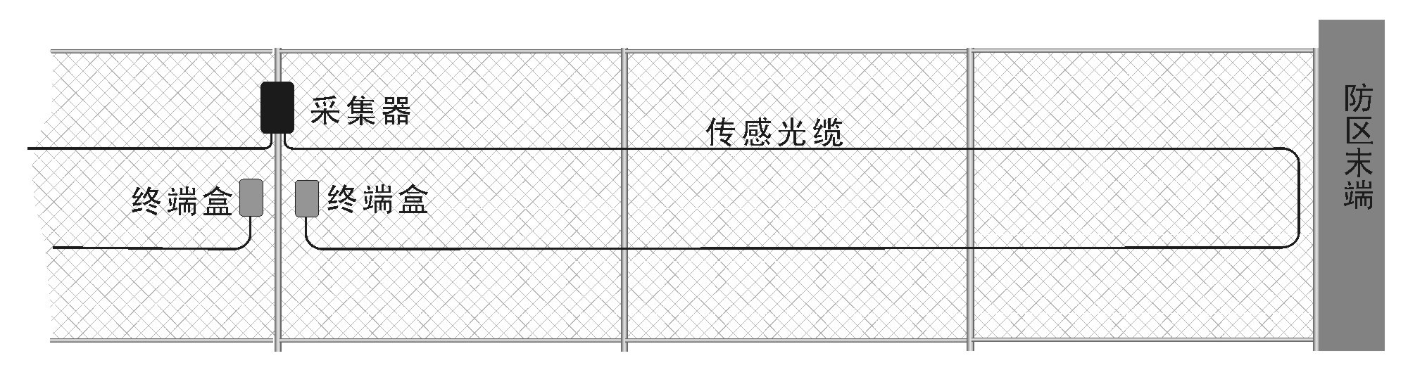 This laying method can detect the invasion of climbing and climbing. Due to the straight-line laying method, less optical cables are needed, so it is suitable for places with low alert level. The sensing optical cable should be laid at about 3/4 of the height of the iron net, and laid in a horizontal straight line. The optical cable and the iron net grid should be tightly fixed with anti-ultraviolet tie or special binding tape every 40cm, as shown in the figure.